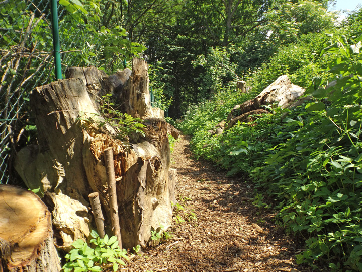 Immer mehr Vögel und Kleinsäuger erobern geeignete Lagen in Großstädten als Lebensräume. Die Kenntnis ihrer Arten und Lebensräume bietet ein hervorragendes Feld für Beobachtungen, Entdeckungen und nachhaltiges Gestalten! Unser 80 Meter langer Weg grenzt an ein buschiges Gelände mit einem kleinen Bach, der Seebek. Der rechtsgelegene Hang mit seinem Baumbestand bietet Umfeld bereits vorkommenden Tieren Unterschlupf- und Nistmöglichkeiten und Kindern ausgiebige Beobachtungsmöglichkeiten einräumen. Dazu wurden Nistkästen für Vögel und Unterschlupfmöglichkeiten (Totholzinseln) für Kleinsäuger geschaffen. DieKinder können anhand der Ringe einer Baumscheibe bestimmen: Wie alt ist dieser Baum geworden?